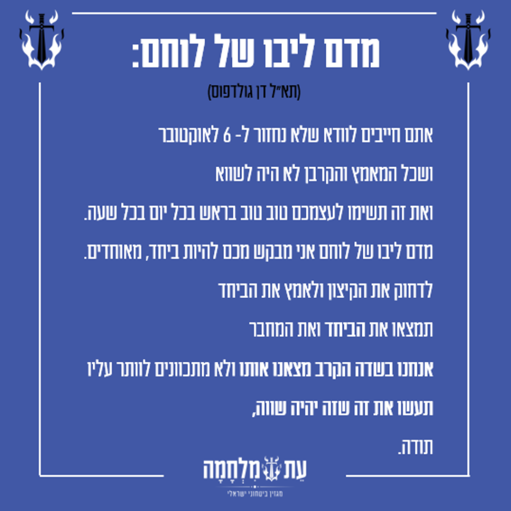 לליבו של לוחם שנלחם מה7 לאוקטובר מיום שבת הארור ומאז לא הפסקתי להילחם.